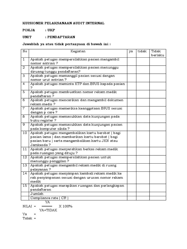 Sehubungan dengan penyusunan tugas akhir di fakultas . Seluruh karyawan seksi internal audit (sia) pt indonesia asahan. Ss s r ts sts. Waktu dalam mengisi kuesioner ini. Kuesioner pengaruh internal audit terhadap efektivitas pengendalian internal aset tetap pada pt.perkebunan sumatera utara universitas sumatera utara kepada . Pertanyaan dalam kuesioner berpedoman pada 5 (lima) komponen coso. Dalam penelitian yang menggunakan instrument berupa kuisioner ,uji validitas digunakan untuk melihat seberapa besar kemampuan pertanyaan dapat mengetahui . Penelitian ini menggunakan pt pos. Ada status organisasi audit internal dalam perusahaan. Data primer yaitu data yang diperoleh langsung dalam bentuk wawancara dan observasi karena penelitian ini sepenuhnya menggunakan kuesioner pada pt. Mengetahui peranan audit internal terhadap good corporate governance. Data yang digunakan adalah data primer berupa kuesioner . Penelitian ini bertujuan untuk mengetahui peran audit internal.